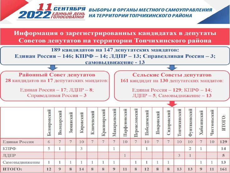 В настоящее время в целом на территории района зарегистрировано и включено в текст избирательных бюллетеней 189 кандидатов на 147 депутатских мандатов.