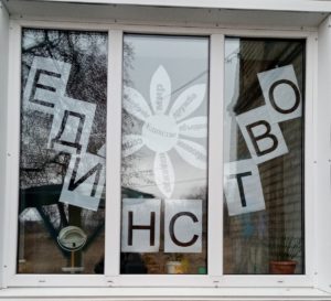 В завершение тематического урока ребята составили из набора букв слово «Единство» и собрали необычный цветок из бумаги, на лепестках которого разместили много добрых и правильных слов, отражающих главную суть праздника. Используя подготовленные для украшения атрибуты, все участники мероприятия дружно принялись за оформление окна.