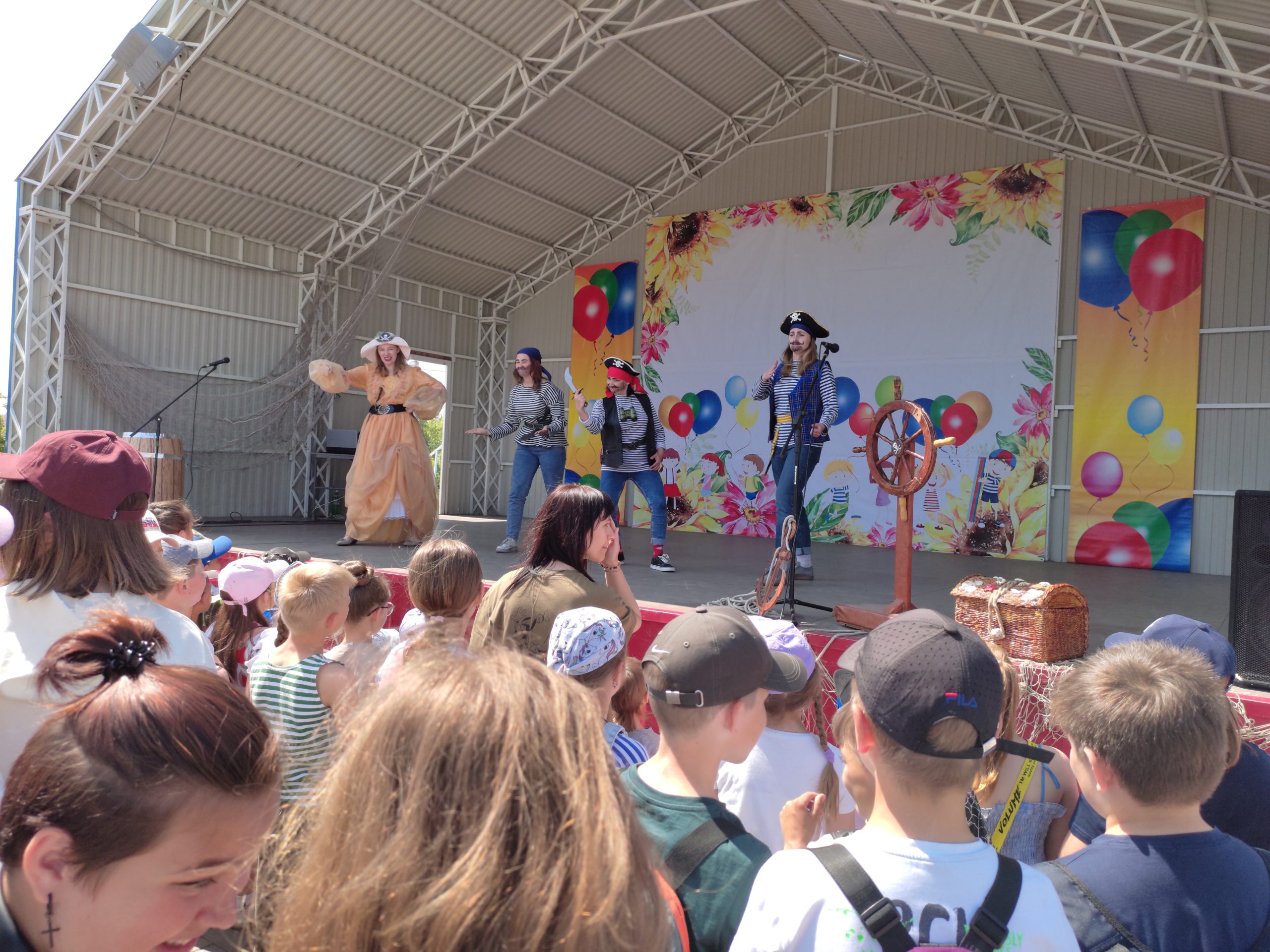 Детей встречали «пиратики» – волонтёры объединения «От сердца к сердцу» (руководитель Анна Владимировна Климова), а участники театрального объединения «Ералаш» (руководитель Светлана Владимировна Ткаченко) поздравляли ребят с праздником и вручали разного цвета фишки, которые в дальнейшем помогли ребятам поделиться на команды.