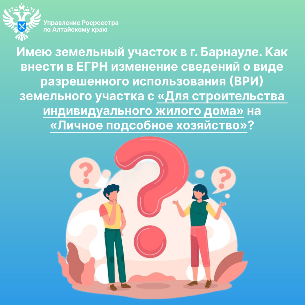 Имею земельный участок в г. Барнауле. Как внести в ЕГРН изменение сведений о виде разрешенного использования (ВРИ) земельного участка с «Для строительства индивидуального жилого дома» на «Личное подсобное хозяйство»?