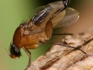 Взрослое насекомое длиной 2–3 мм, внешне напоминает плодовую мушку — красноглазую дрозофилу, глаза черные, тело желтоватое или коричневатое. Грудь крупная, горбовидная. Передвигается муха преимущественно прерывистыми перебежками, похожими на скачущие движения. Личинки мухи достигают максимального размера 5 мм, обнаруживаются в загрязненных пищевых продуктах: сое, муке, сыре, высушенной рыбе, гниющем картофеле. Гниющие растения и грибы, мертвые членистоногие и моллюски, испражнения животных и человека, а также их трупы — обычная пищевая среда для этих насекомых.