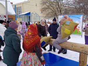 А затем праздник продолжили концертные номера в исполнении народного ансамбля «Россияночка», ансамбля «Калинушка», солистов Юлии Чунихиной, Марии Романовой, Галины Гюнтер, Галины Кряжевой, а также игры, конкурсы, забавы, в которых участники могли помериться силой, ловкостью, хитростью и храбростью. Традиционные масленичные состязания – бой мешками на бревне, столб с подарками, забег в мешках, гири, поедание блинов на скорость, конкурс частушек – собрали немалое количество желающих.