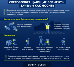 Уважаемые пешеходы, помните, что ваша безопасность в ваших руках! Используйте световозвращающие элементы на одежде во время передвижения по проезжей части в темное время суток или в условиях недостаточной видимости. Кроме того уделите особое внимание юным участникам дорожного движения. Проконтролируйте, что бы на ваших детях всегда были элементы со световозвращающим покрытием.