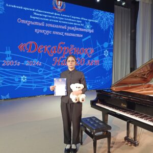 Талантливая ученица начала обучение в школе искусств в 2016 году. Все годы обучения она принимала активное участие в концертно — просветительской жизни школы, достигала высоких результатов в конкурсах разного уровня. Любознательная, начитанная, неординарная, способная к импровизации, обладающая ярким музыкальным дарованием, чуткая к окружающим, Анна хорошо училась как в средней школе, так и в музыкальной. Её игра на инструменте – ответственность за каждый звук, откровение, то волшебное и чарующее, то страстное или весёлое. Аня играет сольный концерт – содержательно и зрело, не по годам. На вступительных экзаменах по специальности Анна исполняла сольную программу наизусть, и сдавала экзамен по сольфеджио. Аттестат Алтайского Государственного музыкального колледжа даёт молодым дарованиям дорогу для поступления в любое высшее образовательное учреждение. Всё это у Анны впереди!